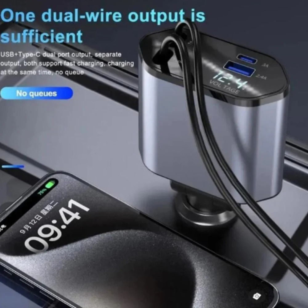 شاحن السيارة القابل للسحب بكابلين للشحن لايتنينج وتايب سي مع منفذين يو إس بي وتايب سي 120 واط